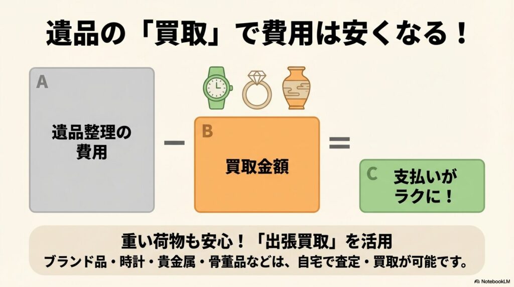 出張買取なら自宅まで査定員が来てくれるので、重い荷物を運ぶ必要がありません。遺品整理と買取を同時に進めることで、費用負担を大幅に軽減できる可能性があります。