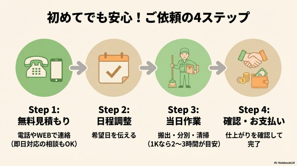 - 当日作業:スタッフが自宅を訪問し、搬出・分別・清掃を行います。1Kなら2〜3時間が目安です。貴重品が出た場合はその場で連絡するよう、事前に確認しておくと安心です。