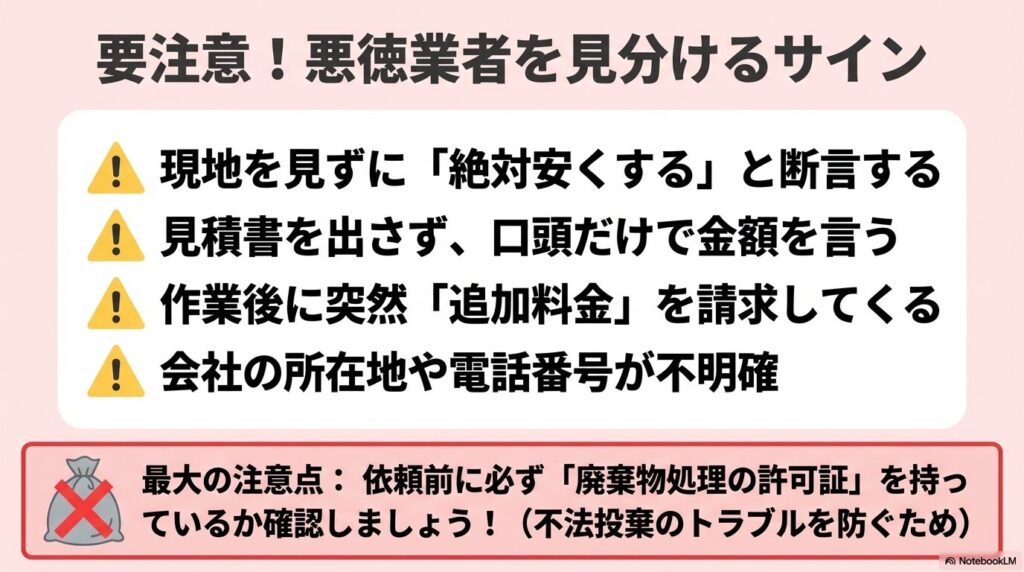 - 追加料金の発生有無と廃棄物処理の許可証は事前にチェック