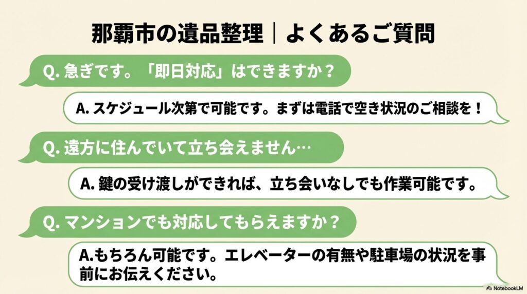 A. もちろん対応可能です。那覇市はマンションが多いエリアですが、エレベーターの有無・駐車スペースの状況などを事前に伝えておくと、スムーズに見積もりが取れます。