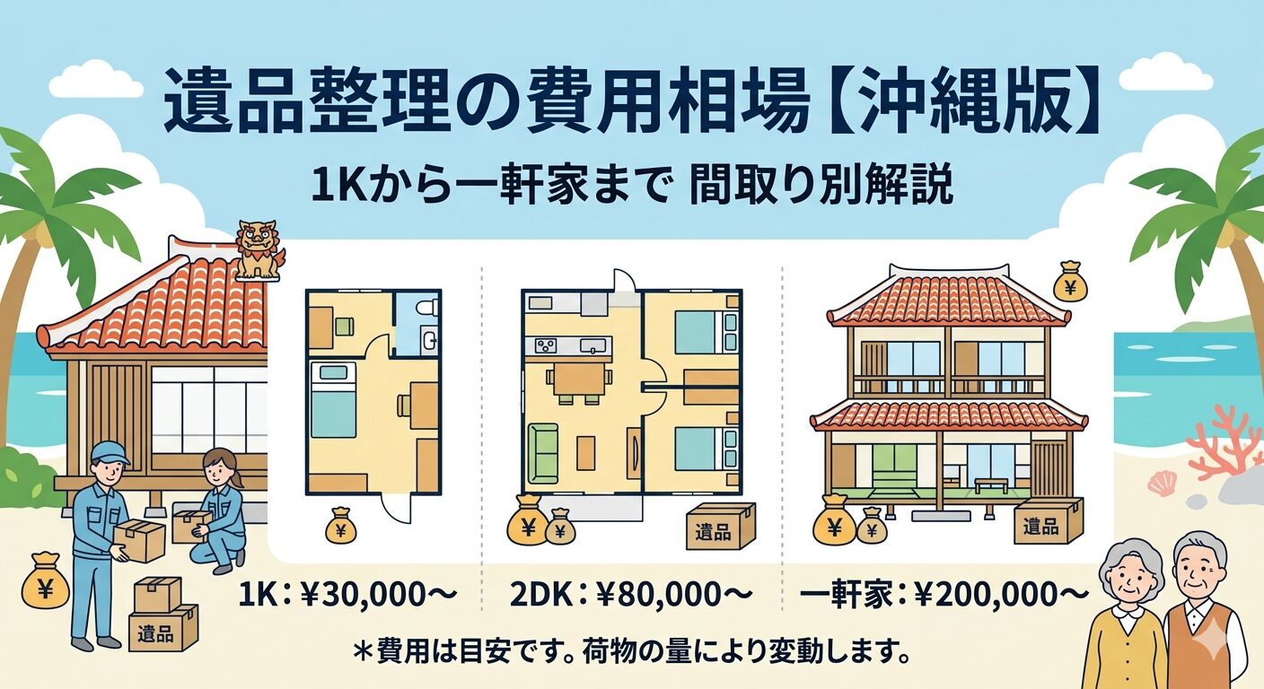 遺品整理の費用は間取り・荷物の量・作業内容によって大きく変わります。何も知らずに依頼すると、想定より高額な請求を受けてしまうことも。この記事では沖縄県内の遺品整理にかかる費用の相場・料金が変わる理由・費用を抑えるコツまで、わかりやすく解説します。