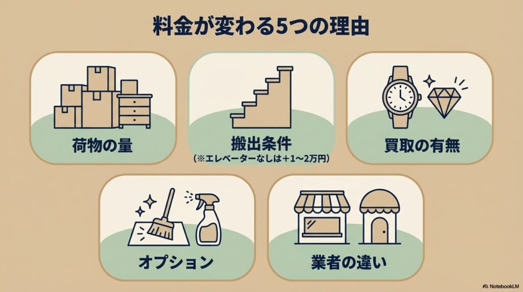 「同じ間取りなのに業者によって金額が全然違う」と感じる方は多いです。遺品整理の費用は以下の5つの要素によって大きく変わります。事前に把握しておくと、見積もり時に納得しやすくなります。