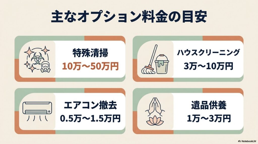 ハウスクリーニングや供養などは必要に応じて選択しましょう。業者に「全部お任せ」にするとオプション料金が積み重なることがあります。