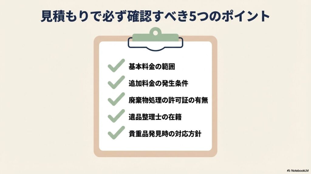 見積もりを取る際に確認を怠ると、後から高額な追加請求につながることがあります。以下のポイントを必ずチェックしてください。