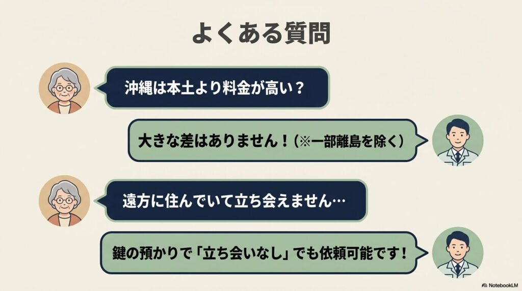 A. 離島などの一部地域を除き、本土との大きな差はありません。ただし、業者によって料金設定は異なります。複数社から見積もりを取って比較することが大切です。